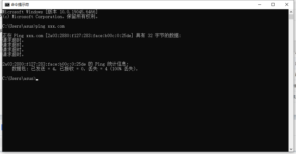 如上图所示,通过在线ping证明域名解析已经生效了的,接下来使用自己的电脑ping看看,这里以windows的cmd命令终端为例,出现请求超时,第一种情况是您自己的本地网络无法访问到您域名解析到的服务器,这种情况就建议更换一台服务器,那另外一种可能是其他域名解析到这台服务器又可以访问?这种情况有可能是域名被你当地的网络运营商拦截了,建议使用移动,联通,电信网络都访问一遍试试,如果移动联通能访问,电信无法访问那证明域名被电信网络拦截了,这种情况我们的建议是更换域名,或者给域名套个CDN试试。
