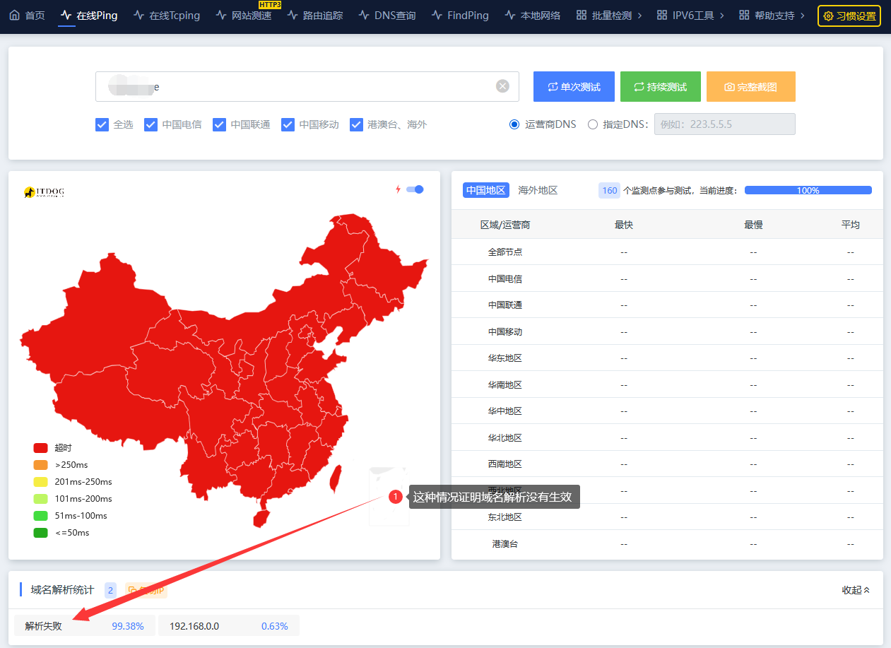 如果在线ping出现请求超时的情况,那证明域名解析没有生效,如果域名刚注册的建议多等等,因为域名解析传播需要一定的时间,一般半个小时左右就生效了,如果超过48小时还没生效这种情况可以联系在线客服查询一下是什么原因。