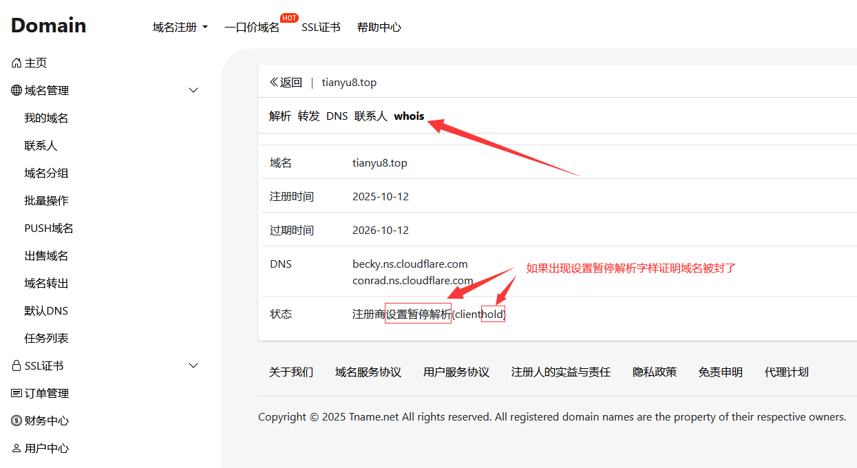 还有一种情况是域名一直用着好好的,突然就访问不了了,这种情况百分之99是域名被注册局或者注册商封了,可通过查询域名Whois来验证一下域名是不是被封了